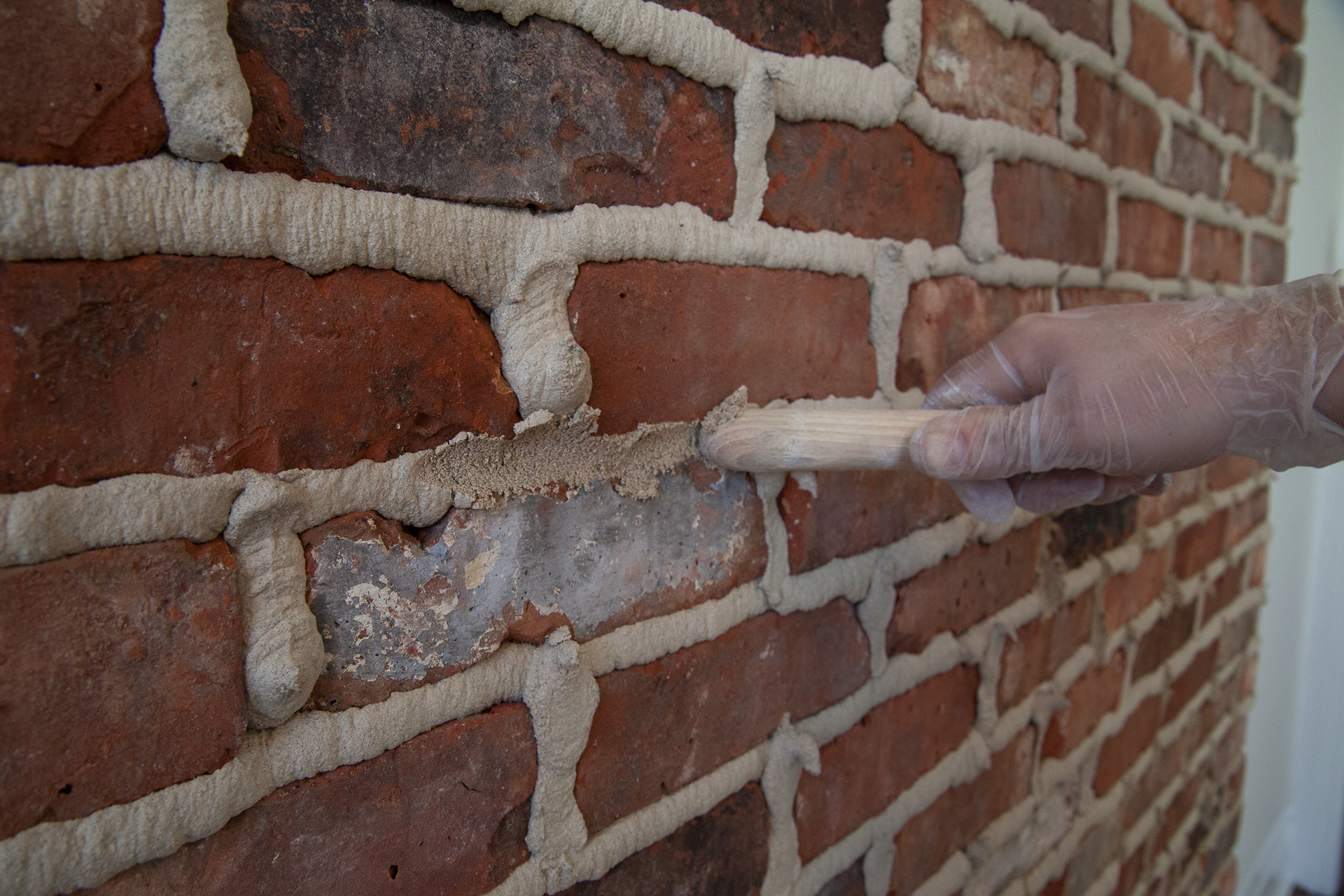 Dampen surface with water. Use either a trowel and tuck pointing tool or a mortar grouting bag to place mortar. Apply mortar to horizontal first, than vertical joints avoiding leaving any voids. Once applied allow to firm to “thumbprint” hardness, trowel, rake and/or brush to the desired finish.