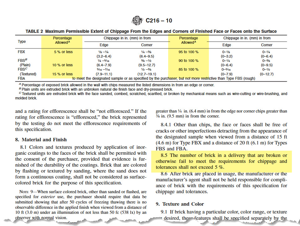 Brick waste and chippage allowances are guided by ASTM standards, which typically permit 5–10% of a shipment to include chipped or broken bricks.